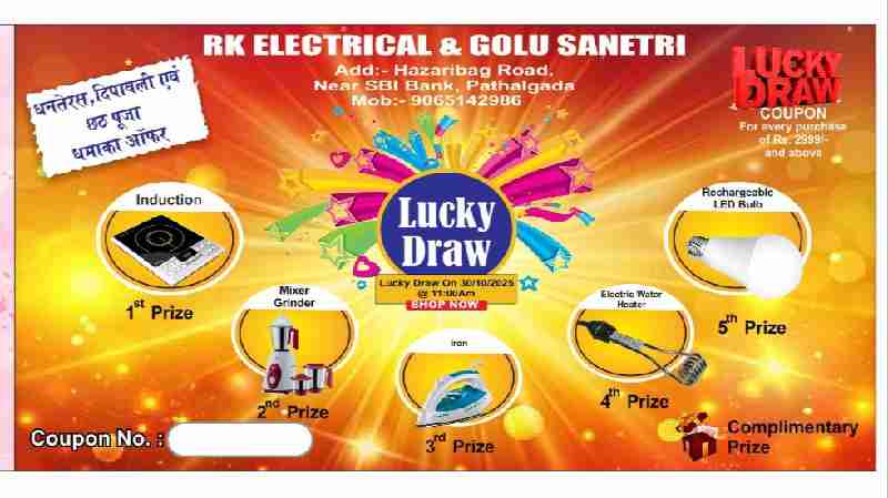 चतरा: इस धनतेरस, दीपावली और छठ पूजा के मौके पर आरके इलेक्ट्रिकल एंड गोलू सेनेटरी की ओर से कई शानदार ऑफर पेश किए गए हैं। ग्राहकों को हर खरीद पर यहां एक लकी ड्रॉ के लिए कूपन दिया जा रहा है। यह ऑफर सीमित समय तक है।